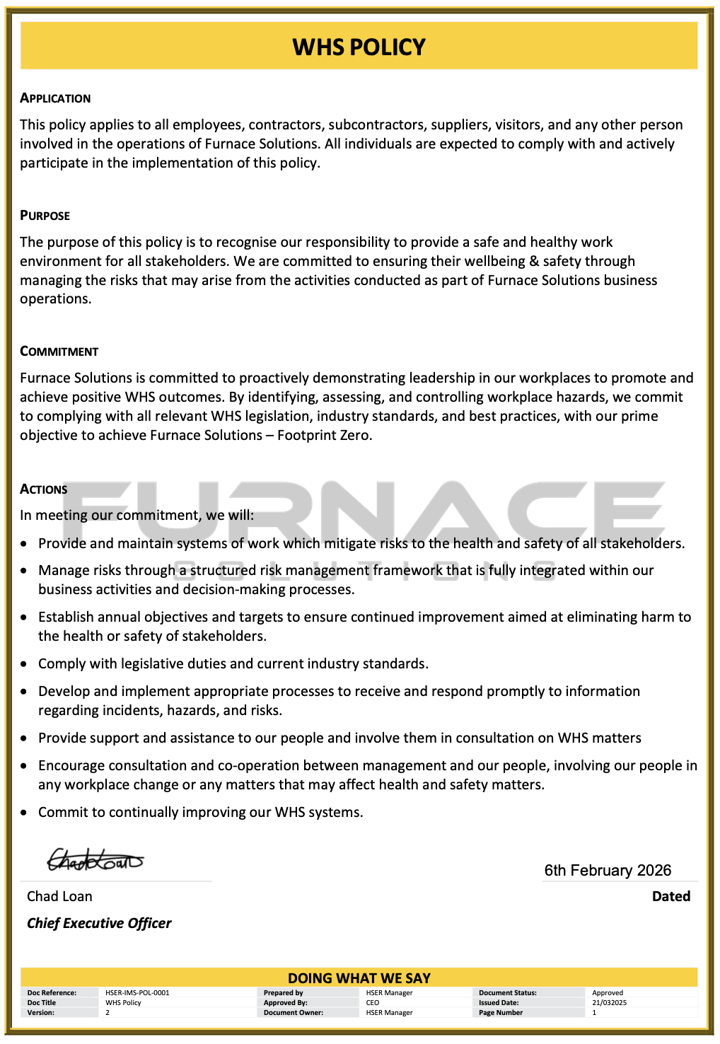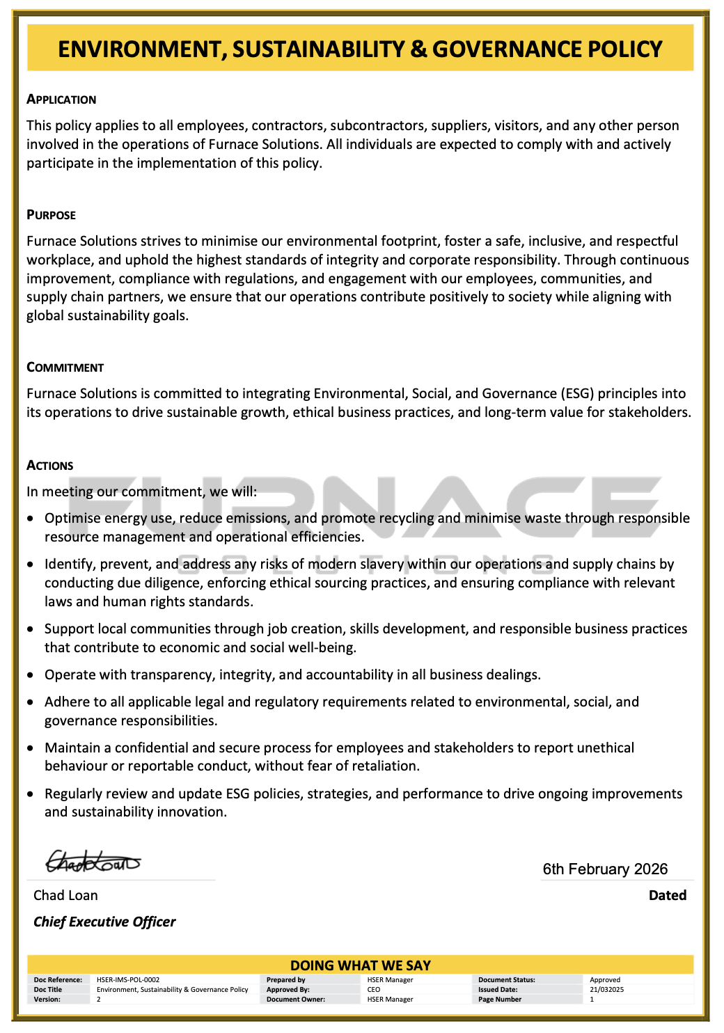 At Furnace Solutions, we are committed to delivering safe, compliant and commercially responsible furnace rebuild, demolition and maintenance services across all our projects and locations. The policies below outline how we work with our clients, partners and people.
